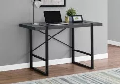 Bold and modern with an industrial inspired design, this versatile computer desk will be a standout in your home office space. The black metal tube legs that wrap and frame the thick spacious desk top, gives it an unmistakable presence. Contrast this edgy look with an elegant gray wood-look finish and it can easily fit into any contemporary-style decor. Just the right size for small spaces, it can hold a laptop and some office essentials within easy reach. Assembly is required.