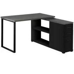 Sleek and contemporary this “”L”” shaped computer desk will be a stunning focal point in your contemporary home office. With clean lines, thick panel construction and sleek track metal legs, this desk is the perfect combination of function, versatility and design in a modern form. The side surface offers an additional workspace with an open concept adjustable shelf that can be used for additional storage. The two medium drawers and file drawer accented with black plastic handles will help to keep documents and clutter organized without sacrificing storage space. This chic grey wood-look and black desk can conveniently be assembled on the left or right side, making this unit uniquely yours to design.