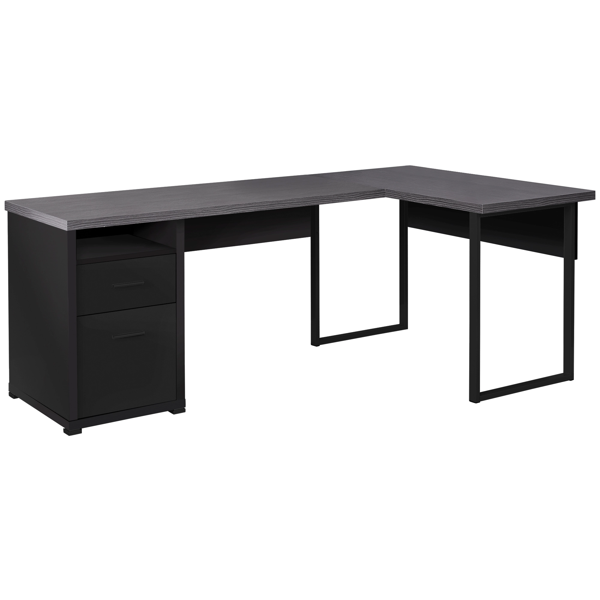 This simple yet practical “”L”” shaped desk will be the perfect addition to your home office. This two tone finished desk in a black and grey wood grain look which can be configured on the left or right-hand side is a great combination of function, durability and design in a modern form. The convenient side drawers provide you with space to store office supplies, papers, file folders, and plenty more. Use the spacious top for your computer desktop, laptop or tablets. Featuring an open concept shelf, a storage drawer, and a file drawer for standard or legal documents both accented with silver coloured drawer pulls, help keep your office supplies and documents organized and desktop clutter free.