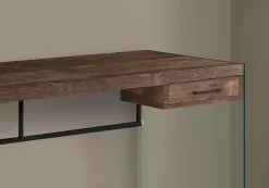 This modern brown reclaimed wood-look desk is the perfect combination of function, durability and design in a modern form. With clean lines, thick panel construction and 8 mm thick tempered glass legs, this desk will add pizzazz to any home office. The desk top provides the ideal surface space for a lamp, picture frames, laptop or tablets to meet your working needs along with a convenient storage drawer for your office supplies.