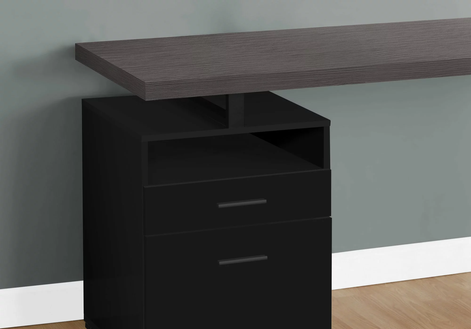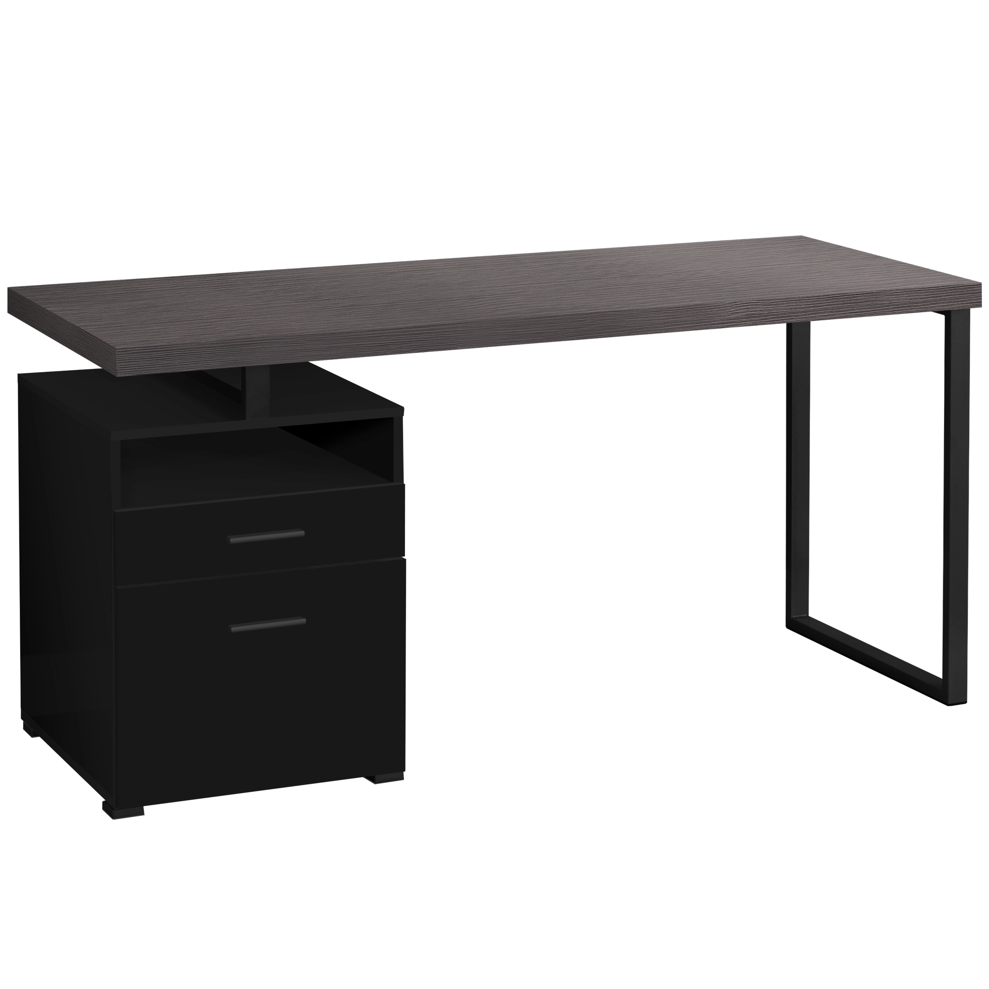 Sleek and contemporary, this black and grey wood grain-look desk which can be configured on the left or right-hand side, is the perfect combination of function, durability and design in a modern form. With clean lines, a floating top workstation and sleek track black metal legs, this desk will add pizzazz to any home office. Featuring an open concept shelf, a storage drawer and a file drawer with black drawers pull to help keep your office supplies and documents organized and desktop clutter free. The large thick panelled surface provides plenty of room to meet your working needs without compromising style.