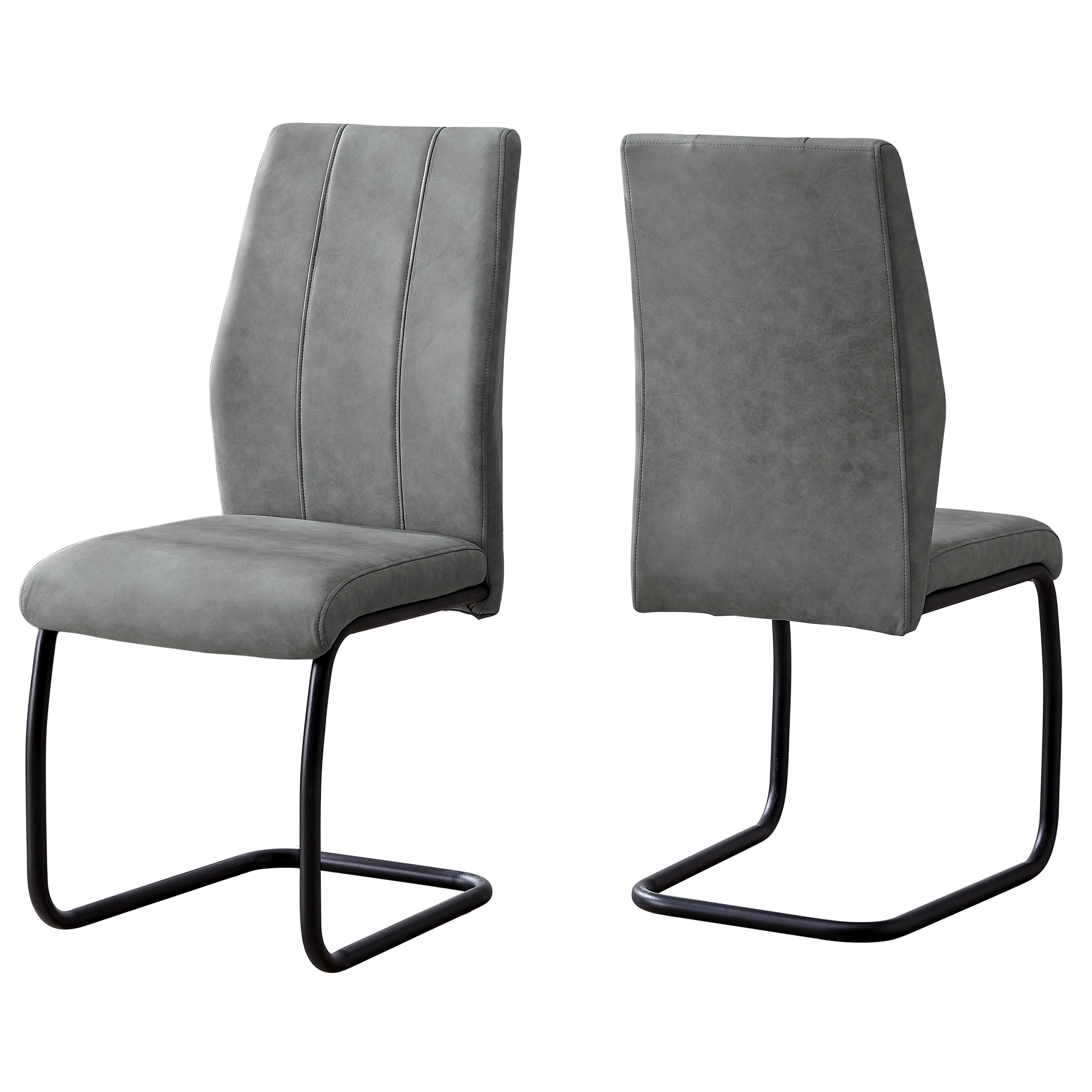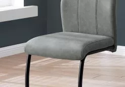 The clean modern lines of this set of 2 side dining chairs will instantly revive your dining space. The chairs are upholstered in a rich faux-suede grey fabric. With a luxuriously comfortable curved back accented with 2 vertical rows of stitching, cushioned seat, and a sturdy u-shaped black metal base you will be dining in style in no time! Mix and match with one of our contemporary style tables to complete the set. Assembly is required.