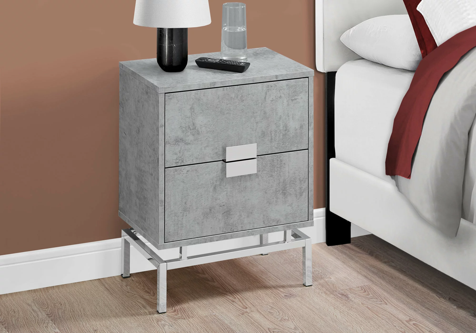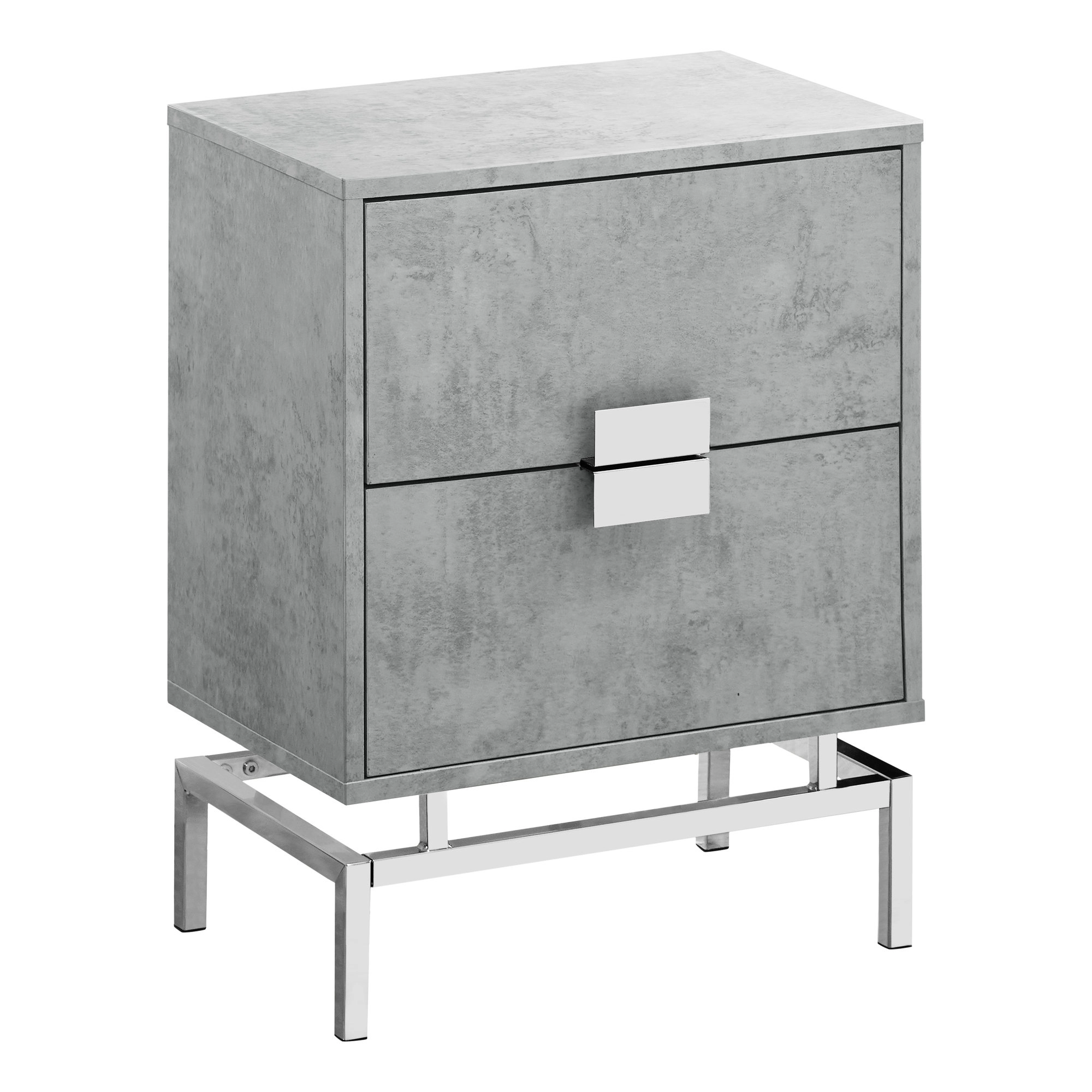 This retro-inspired side/end accent table gives a modern glamorous look to a room. Finished in a stylish laminated gray cement look on all sides, with two large storage drawers on metal glides accented with chic silver metal drawer pulls that meet together as one. The bold yet simple silver chrome metal base elevates this accent table to another dimension. Versatile to use as a nightstand for a modern bedroom or next to a sofa or chair as a side table, this is one statement making accent furniture piece. Assembly is required.