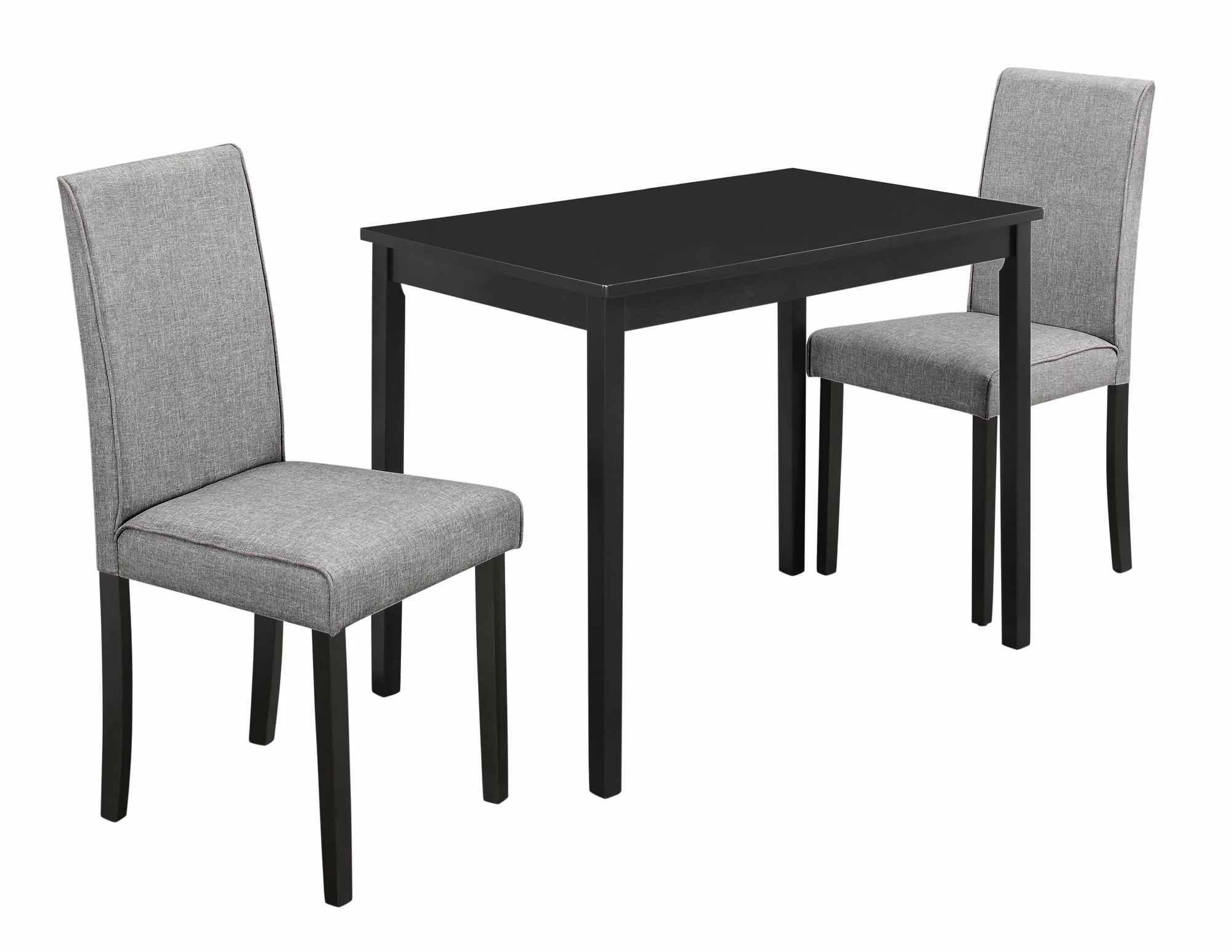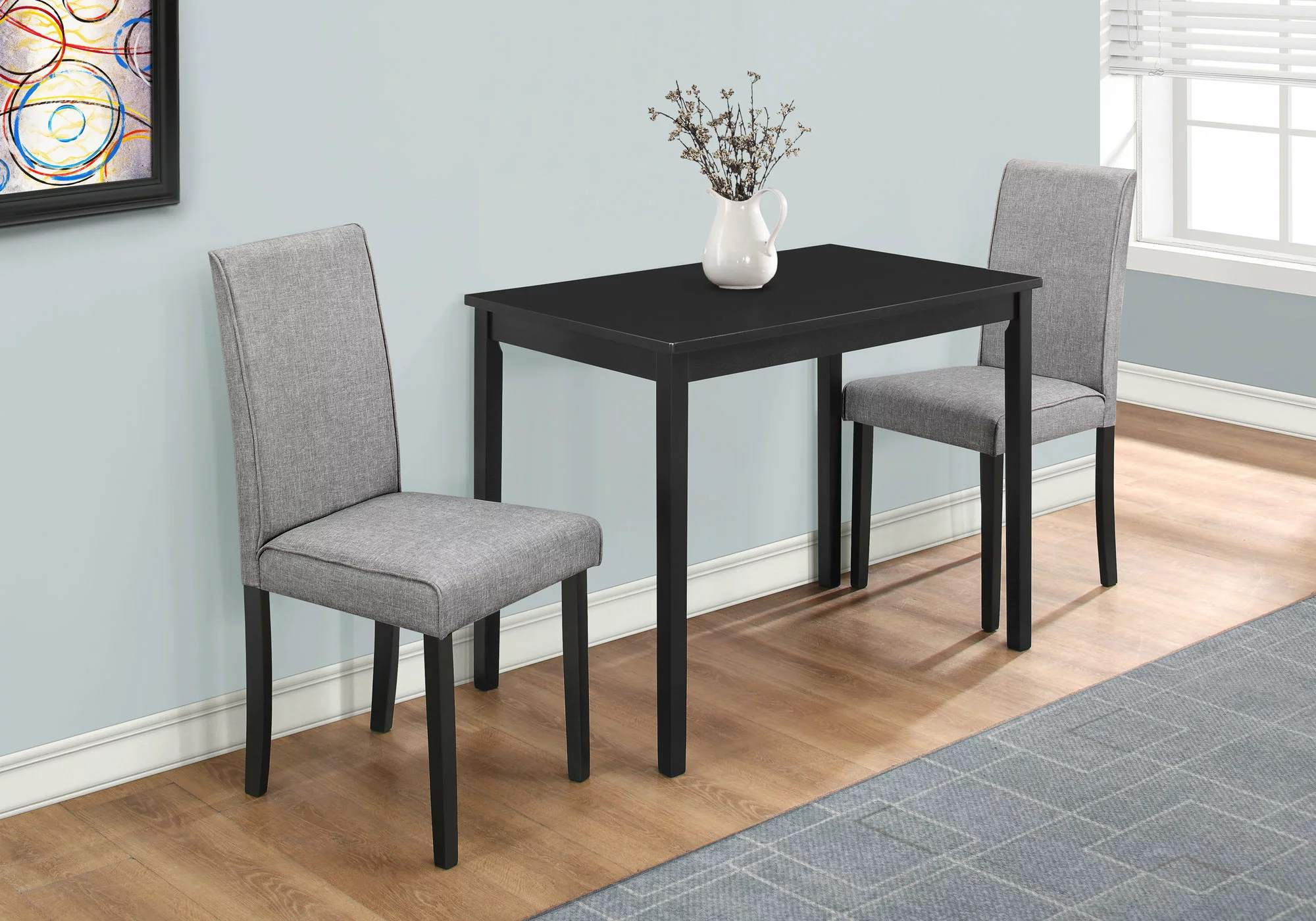 This casual dining set offers a classic styling that will compliment any decor. Perfect for small spaces, the rectangle dining table features an ample surface area with two solid wood legs. The comfortably padded dining chairs are finished in an elegant and durable gray linen material. The simple lines of this dining set with a rich black finish create a timeless look that you will love.