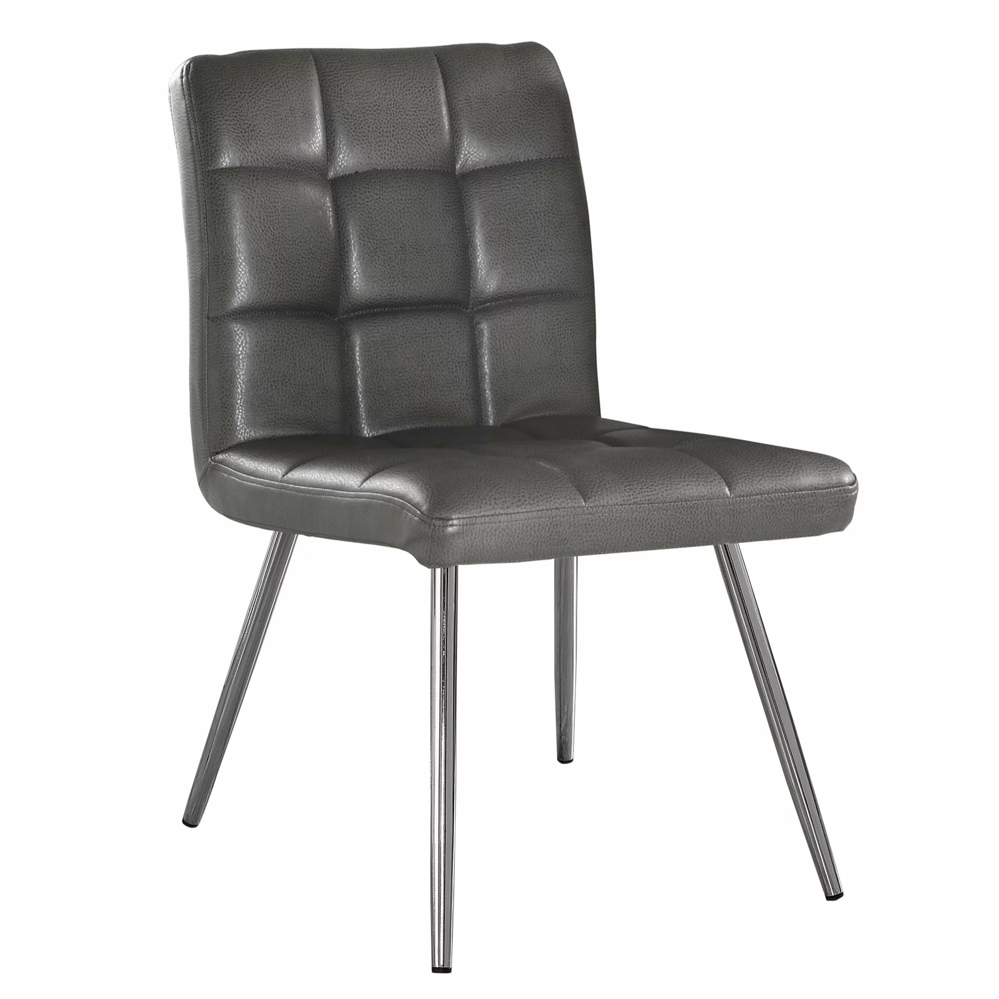 Bring a touch of modern elegance into your home with the clean design of this set of 2 contemporary grey leather- look dining chairs. Featuring a comfortable quilted seat and back and sleek, sturdy chrome metal legs these chairs will easily style your room.