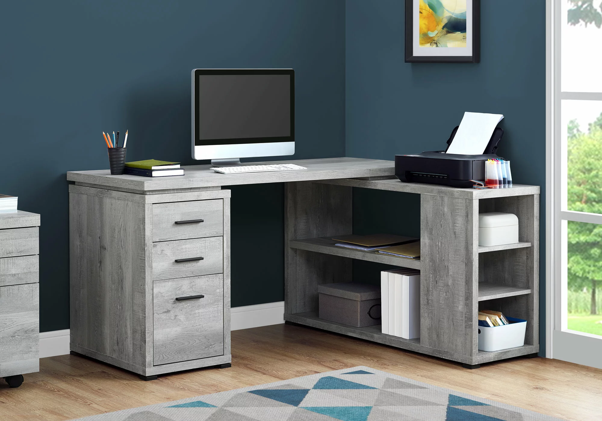- The side shelf unit can be assembled on the left or right side of the desk