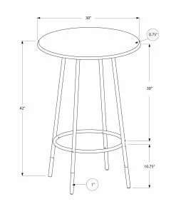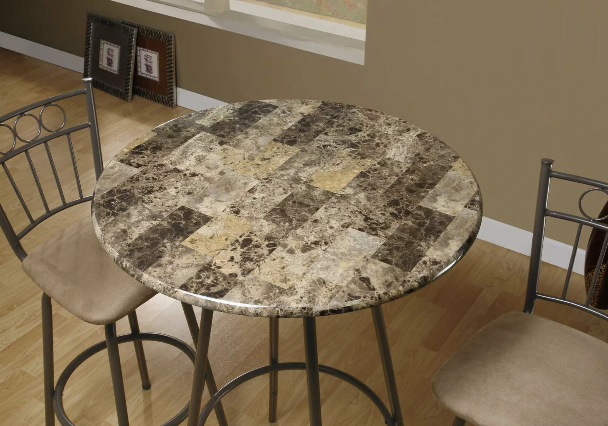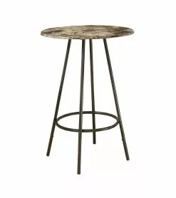 - Sturdy dark brown metal legs with a round cappuccino marble-look table top