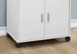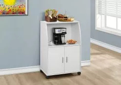 A valuable addition to any home, this multipurpose cart by Monarch Specialties®will add storage and functionality to your cooking space. The double door closed storage space includes one adjustable center shelf to help keep you organized while the open storage on top makes a perfect space to put a coffee maker, toaster or cooking books. With clean lines, white finish, silver colored door handles and castors for easy mobility, this cart is the perfect addition to any modern kitchen. This cart is also a great storage solution for laundry rooms or craft rooms!