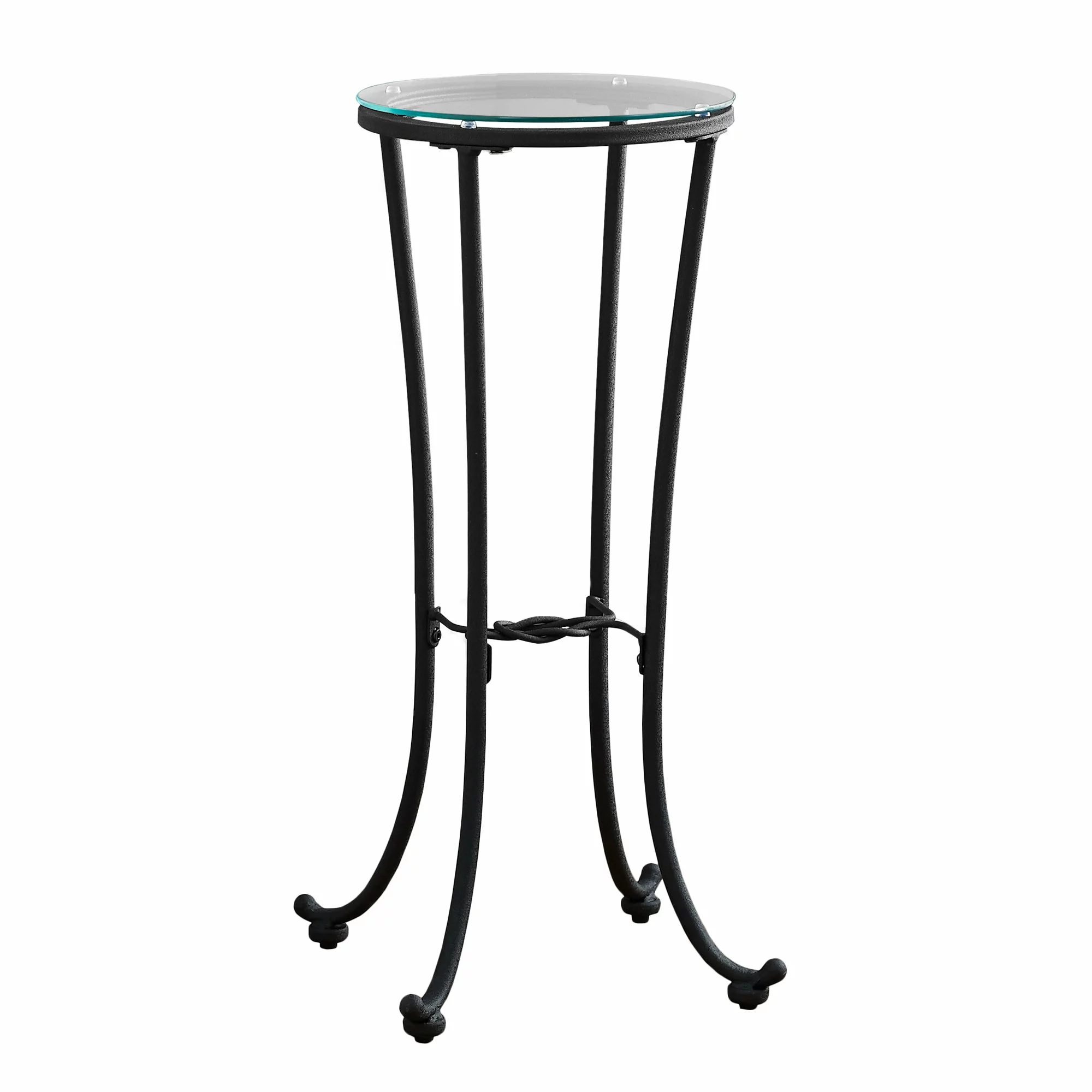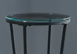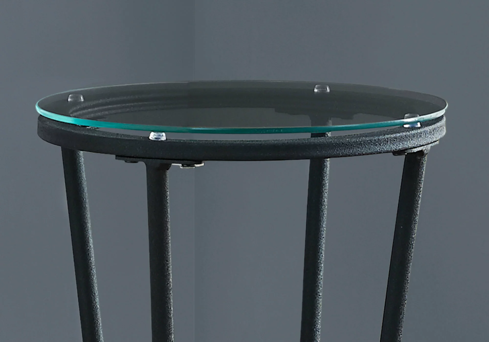 This simple yet elegant black hammered metal accent table with a clear tempered glass top is not only stylish for your living space, but also multi-functional. The round glass top has enough space to hold a beautiful plant or a cherished decorative item. With metal legs that gracefully curve out at the feet and the legs bonded together with a decorative knot for stability, this easy to assemble accent table brings a classic contemporary look to any room.