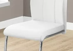 The clean modern lines of this set of 2 sides dining chairs will instantly revive your dining space. The chairs are upholstered in a sleek white leather-look material. With a luxuriously comfortable curved back accented with vertical rows of stitching, cushioned seats, and a sturdy u-shaped chrome metal base you will be dining in style in no time!