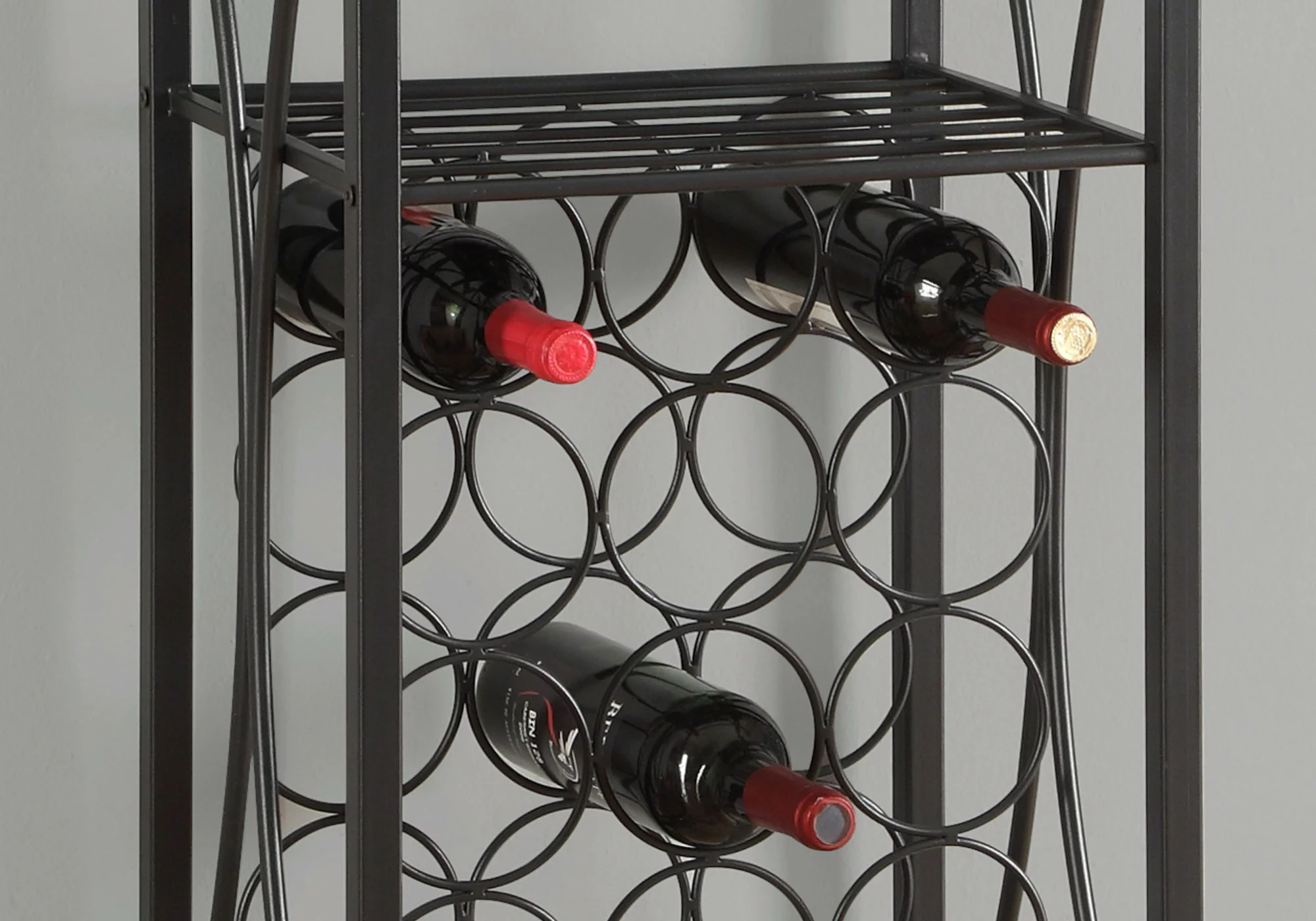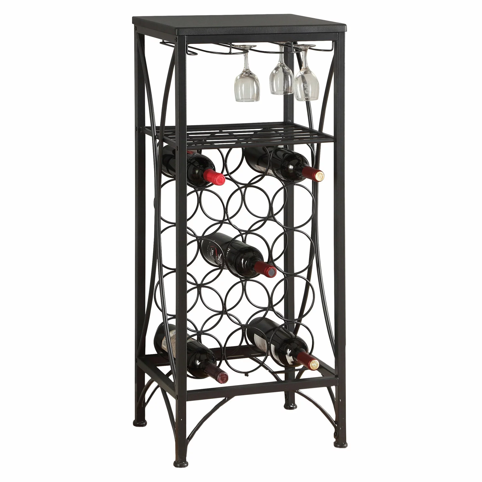 This contemporary wine rack by Monarch Specialties® will add style and utility to your dining area. Constructed with high quality metal, this wine rack holds up to 15 wine bottles and features a convenient hanging glass rack that can holds 6 standard wine glasses and a surface area to prepare your drinks. Ideal for dining rooms and kitchens.