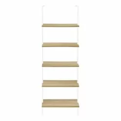 This charming and minimalist ladder bookcase is a great way to bring modern style to your decor. It is crafted with an open metal frame that mounts to the wall to keep it in place. Five-tier ample shelving made from engineered wood provide the perfect place for books, plants, bar essentials, or anything else you want to display. Mount this tall and narrow space-saving bookshelf to the wall in your home office, your living room, or your bedroom.