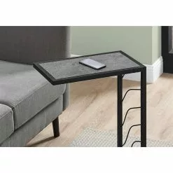 Straight lines and subtle curves give this C-shaped accent table an elegant, contemporary look. The rectangular tabletop in a textured, grey stone-look finish is bordered by a black metal frame that extends down to the base. A wave pattern design on the frame adds a decorative touch. This versatile end table is ideal for living rooms or bedrooms as a convenient surface to place items like a small clock, remote, or mobile device.