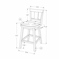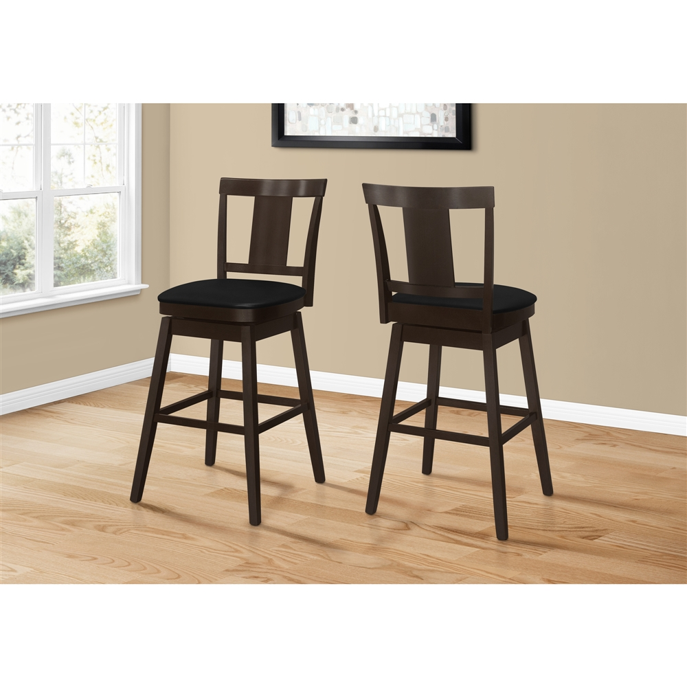 These barstools have your back if you need comfortable seating for a bar table. They feature backrests that curve gently for a supportive feel and have a wide, vertical panel for a decorative touch. The seats are upholstered in a smooth, black leather-look fabric and are cushioned for softness. For convenience, these bar chairs swivel 360 degrees so you can turn around without standing up. Providing stability are solid wood legs and footrests in a rich, dark-brown espresso finish. Sold as a set of 2, these stylish bar-height stools with backs are easily paired with a pub table in casual dining areas, such as an eat-in kitchen or a home bar.