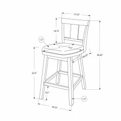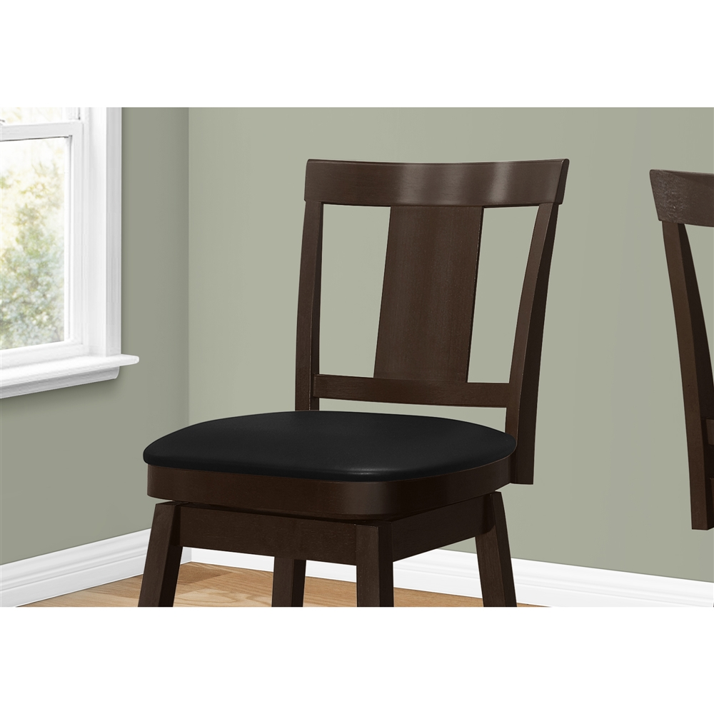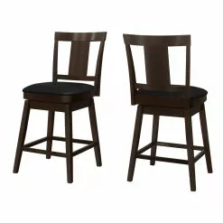 These barstools have your back if you need comfortable seating for a counter-height table. They feature backrests that curve gently for a supportive feel and have a wide, vertical panel for a decorative touch. The seats are upholstered in a smooth, black leather-look fabric and are cushioned for softness. For convenience, these counter-height chairs swivel 360 degrees so you can turn around without standing up. Providing stability are solid wood legs and footrests in a rich, dark-brown espresso finish. Sold as a set of 2, these stylish stools with backs are easily paired with a kitchen island or counter-height table in casual dining areas such as an eat-in kitchen.