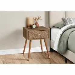 Exquisite styling and exceptional functionality make this accent table with storage a standout piece for a living room or bedroom. A distinctive, rippled pattern on the drawer front delivers a captivating visual effect and adds an unexpected element of texture. Gold drawer knobs and detailing on the legs bring a subtle touch of glam. Solid wood legs, which are round and have a tapered shape, mix sturdy construction with chic design.
